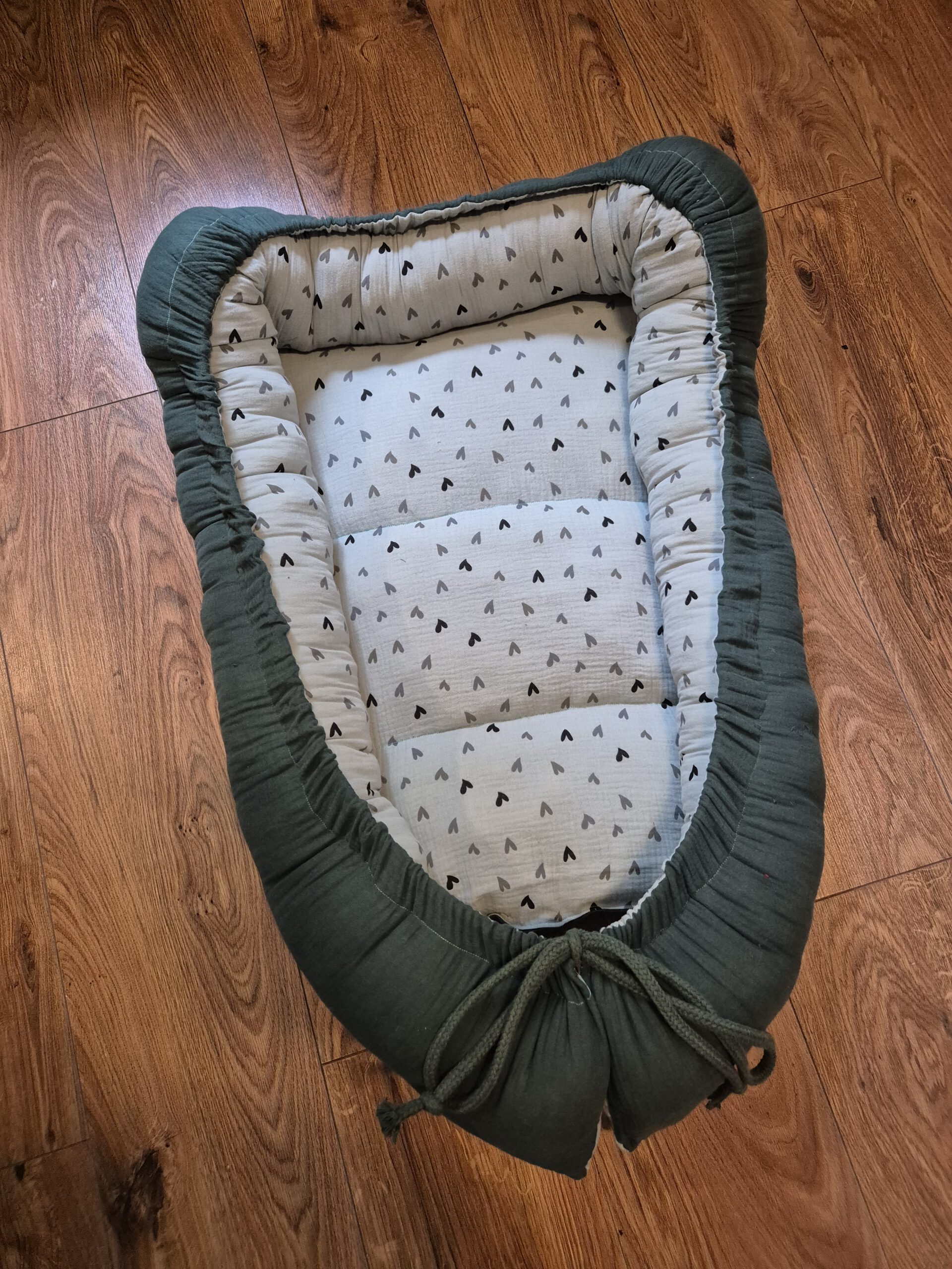 Dieses handgefertigte Babynestchen bietet deinem kleinen Schatz einen sicheren, kuscheligen Rückzugsort. Es wird wahlweise aus weicher Baumwolle oder luftigem Musselin gefertigt und ist mit Füllwatte gefüllt, damit dein Baby bequem und geschützt liegt.