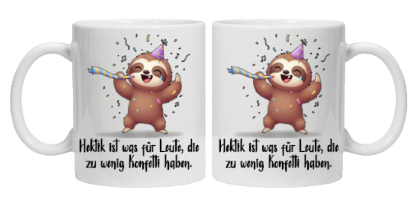 • Die Party-Flash Tasse: Bedruckt mit unserem feierwütigen Faultier, das bereit ist, jede Kaffeepause in ein kleines Festival zu verwandeln. ✨🎸