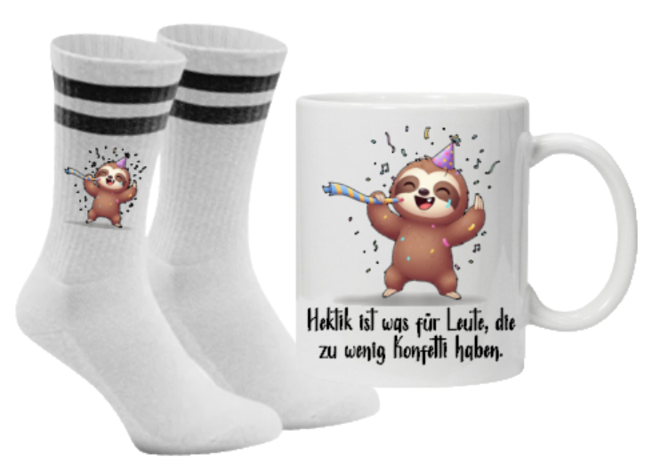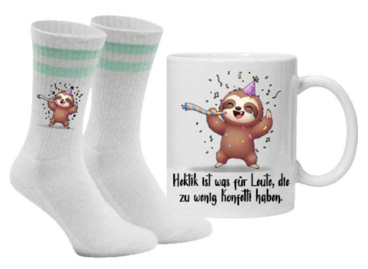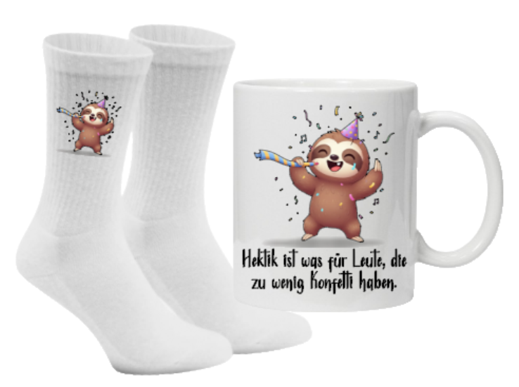• Das Motto „Hektik ist was für Leute, die zu wenig Konfetti haben.“: Der ultimative Spruch für alle, die wissen, dass ein bunter Moment mehr wert ist als ein schneller Sprint. Die Tasse sorgt für den nötigen Schwung in der Hand, die Socken für den Rhythmus in den Füßen. 🎊☕️