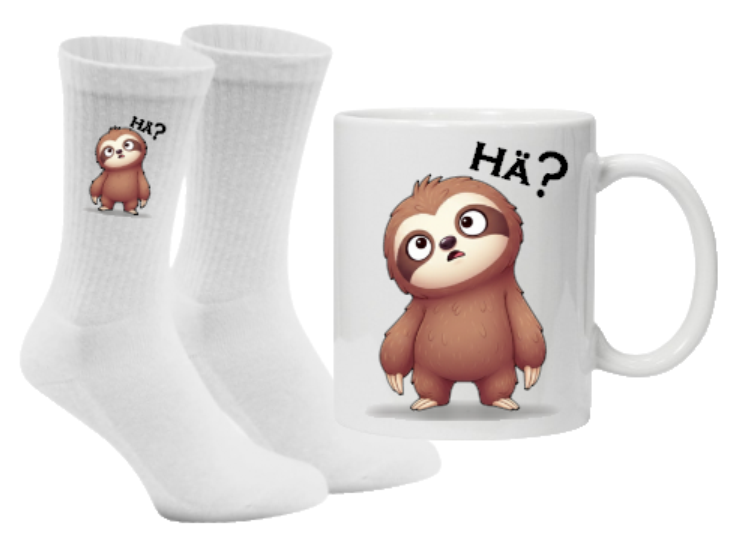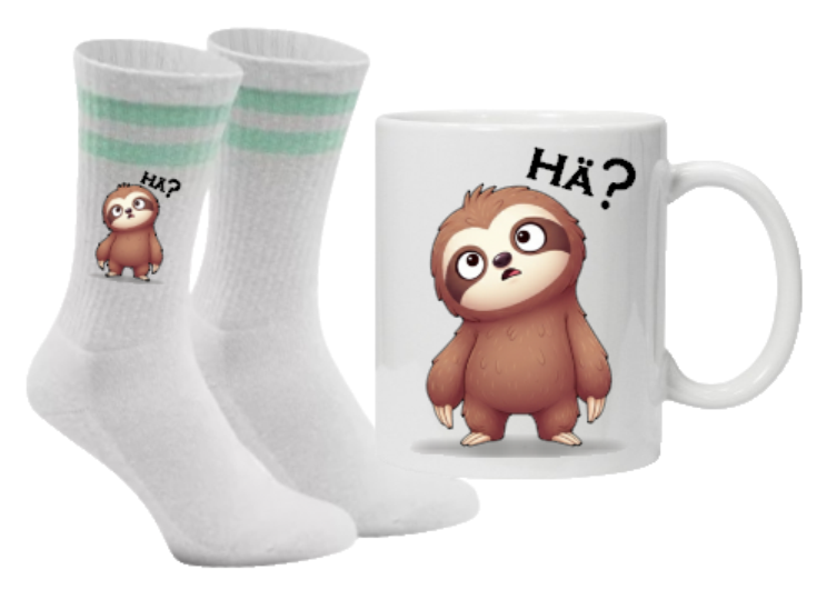 Flashs Planlos-Bundle besteht aus einer Tasse und einem Paar Tennissocken mit unserem sehr verpeilten Faultier Flash.