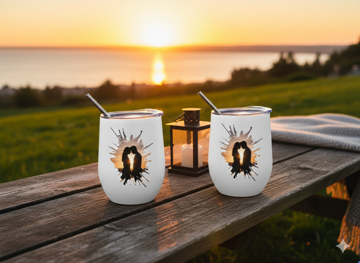Das Herzstück des Designs ist das romantische Silhouetten-Motiv: Ein Paar, das sich tief in die Augen schaut, die Stirn aneinandergelegt, während im Hintergrund die Sonne im Meer versinkt. Ein Symbol für eure tiefe Verbundenheit. ❤️